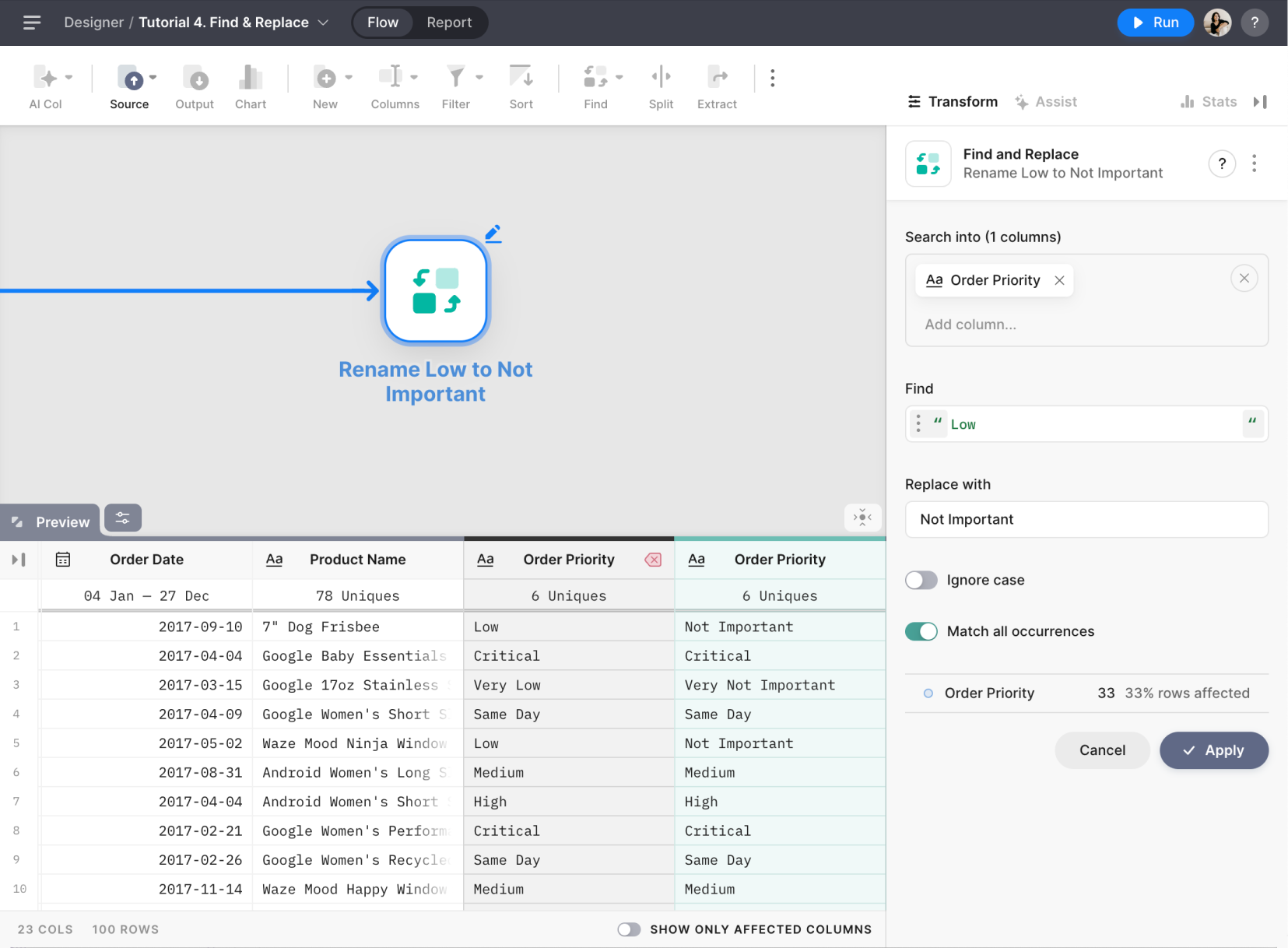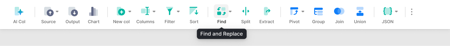 The Find and Replace Node allows you to search for specific text within one or multiple columns in your dataset and replace the found text with a specified value. In this guide, we will explain the properties and functionalities of the Find and Replace Node.