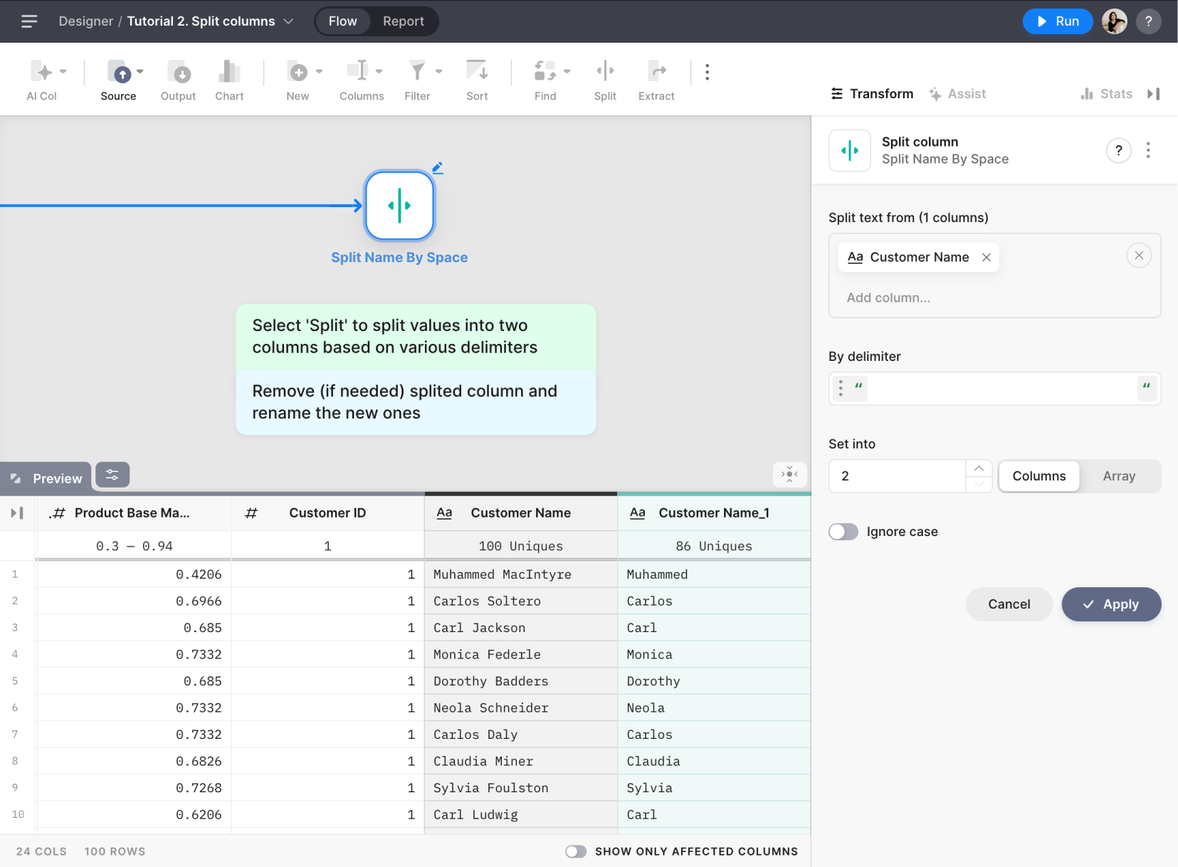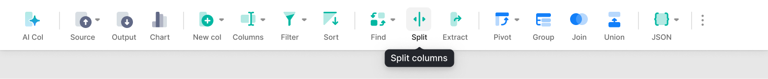 The Split Node allows you to split text from one or multiple columns in your dataset into separate columns or arrays based on a specified delimiter.