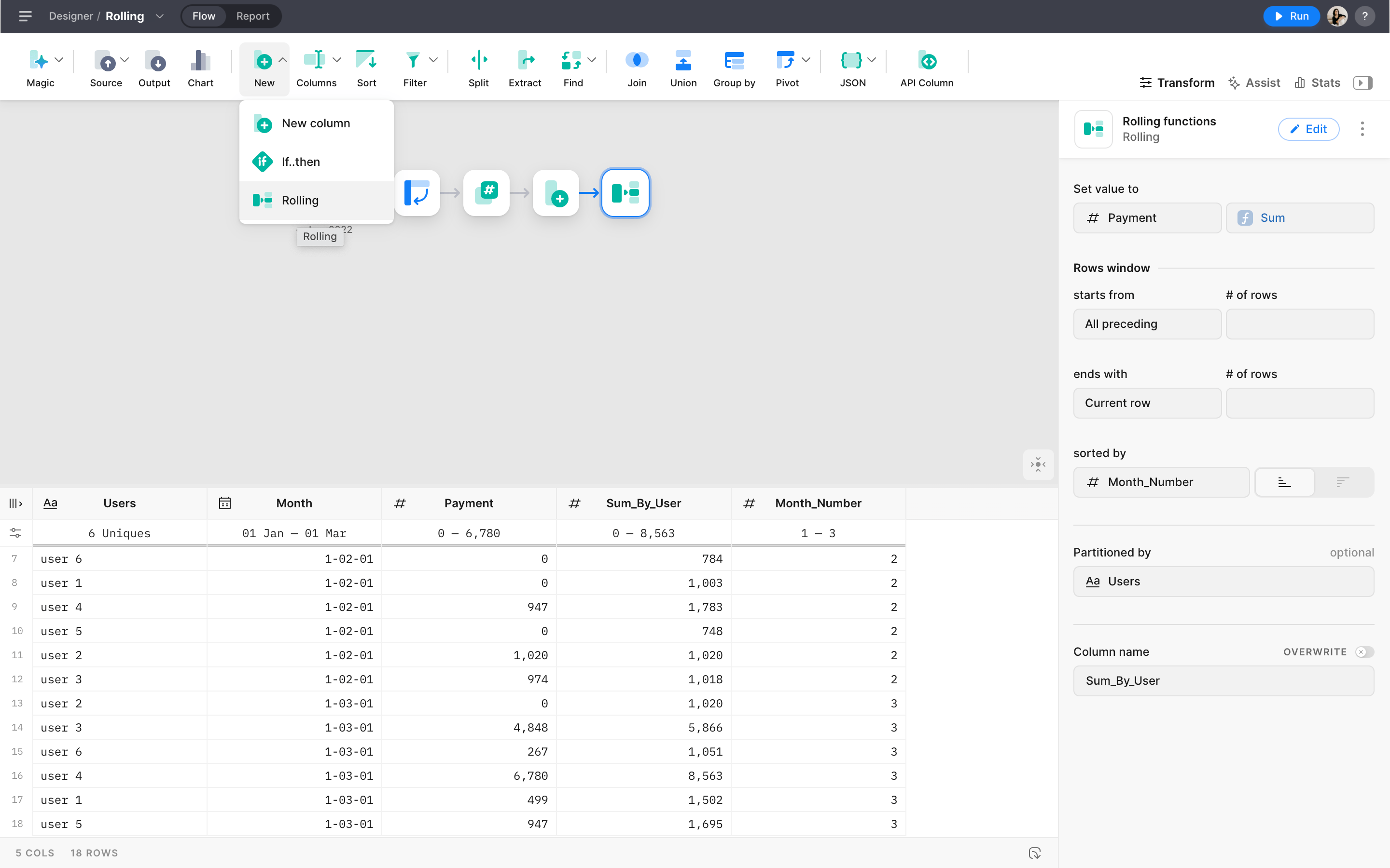 The rolling node allows you to perform calculations across a set of rows related to the current row. Unlike regular aggregate functions, which return a single value for a group of rows, window functions return a value for each row based on the rows within its "window."&#x20;