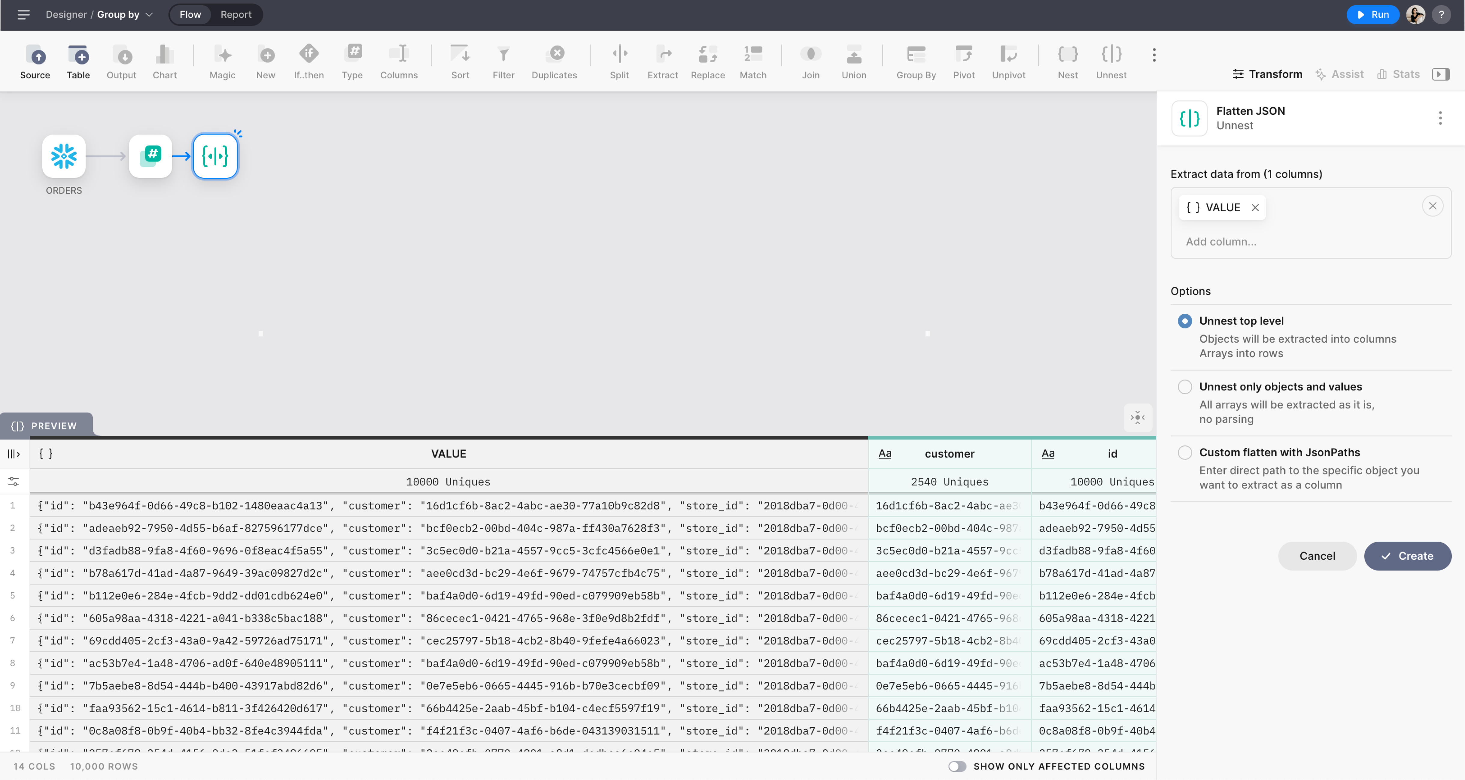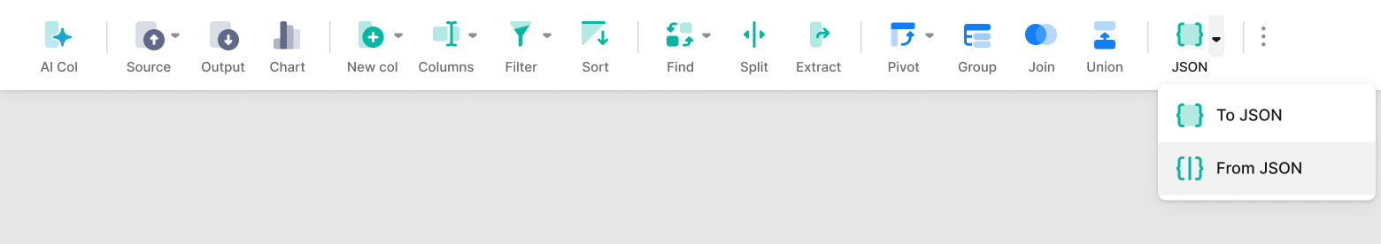 The From JSON Node allows you to expand structured data fields, like arrays or objects, back into individual columns and rows. Adding this node lets you deconstruct complex column structures to enable easier analysis and reporting.&#x20;