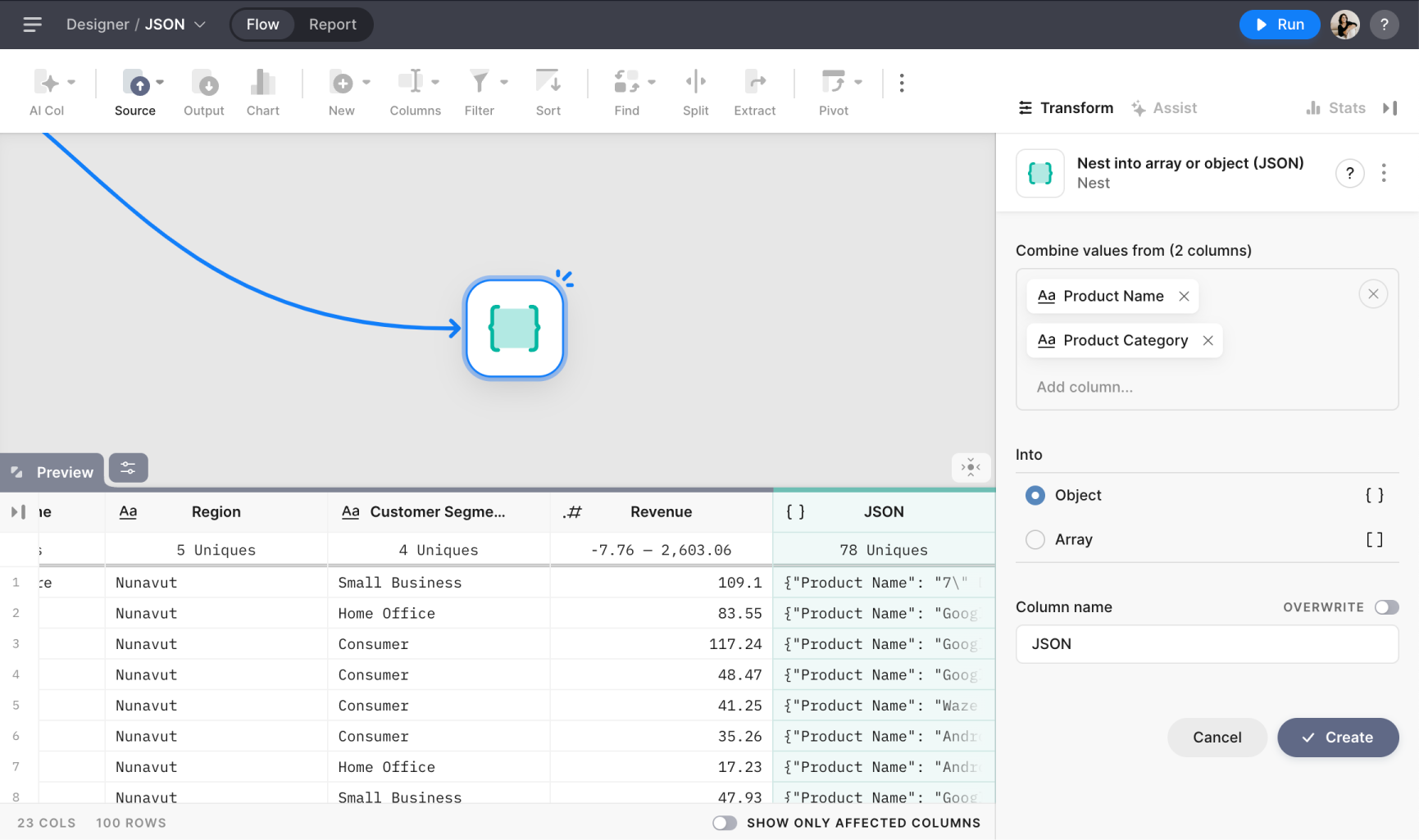 The To JSON Node provides a powerful way to combine multiple columns into a single column with structured data, such as arrays or objects. This is especially useful when dealing with hierarchical or relational data and wanting to keep related values bundled together.