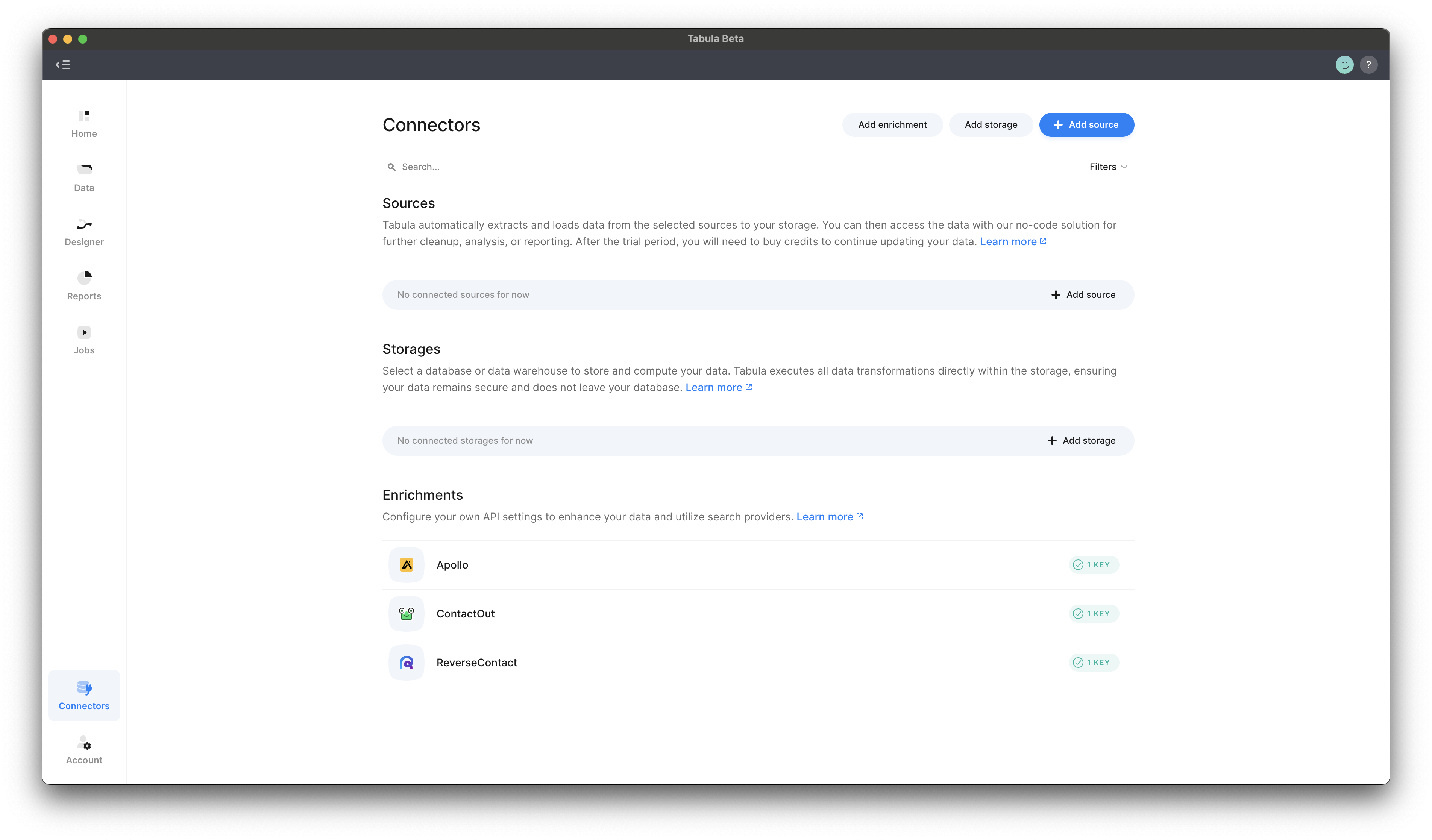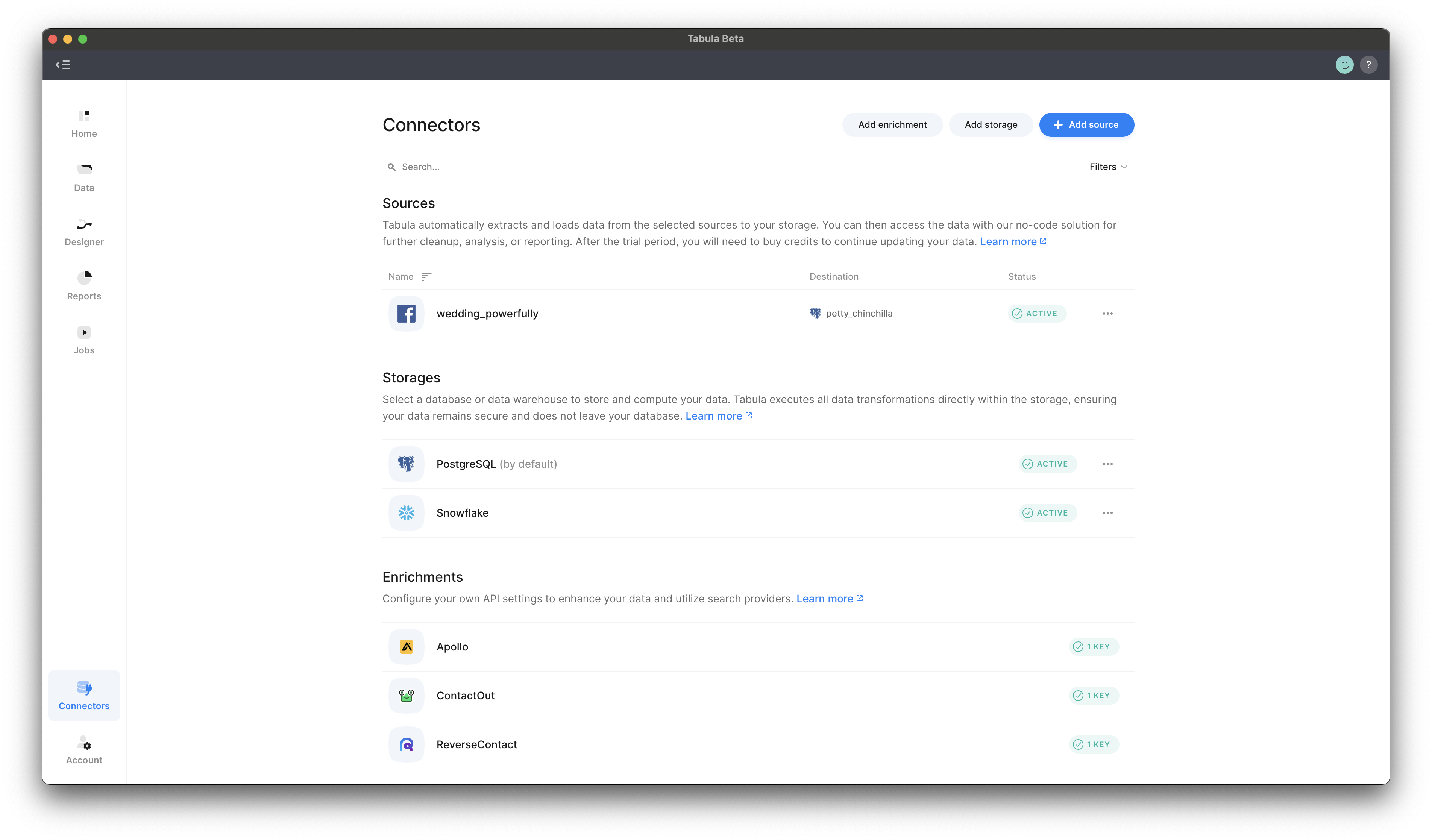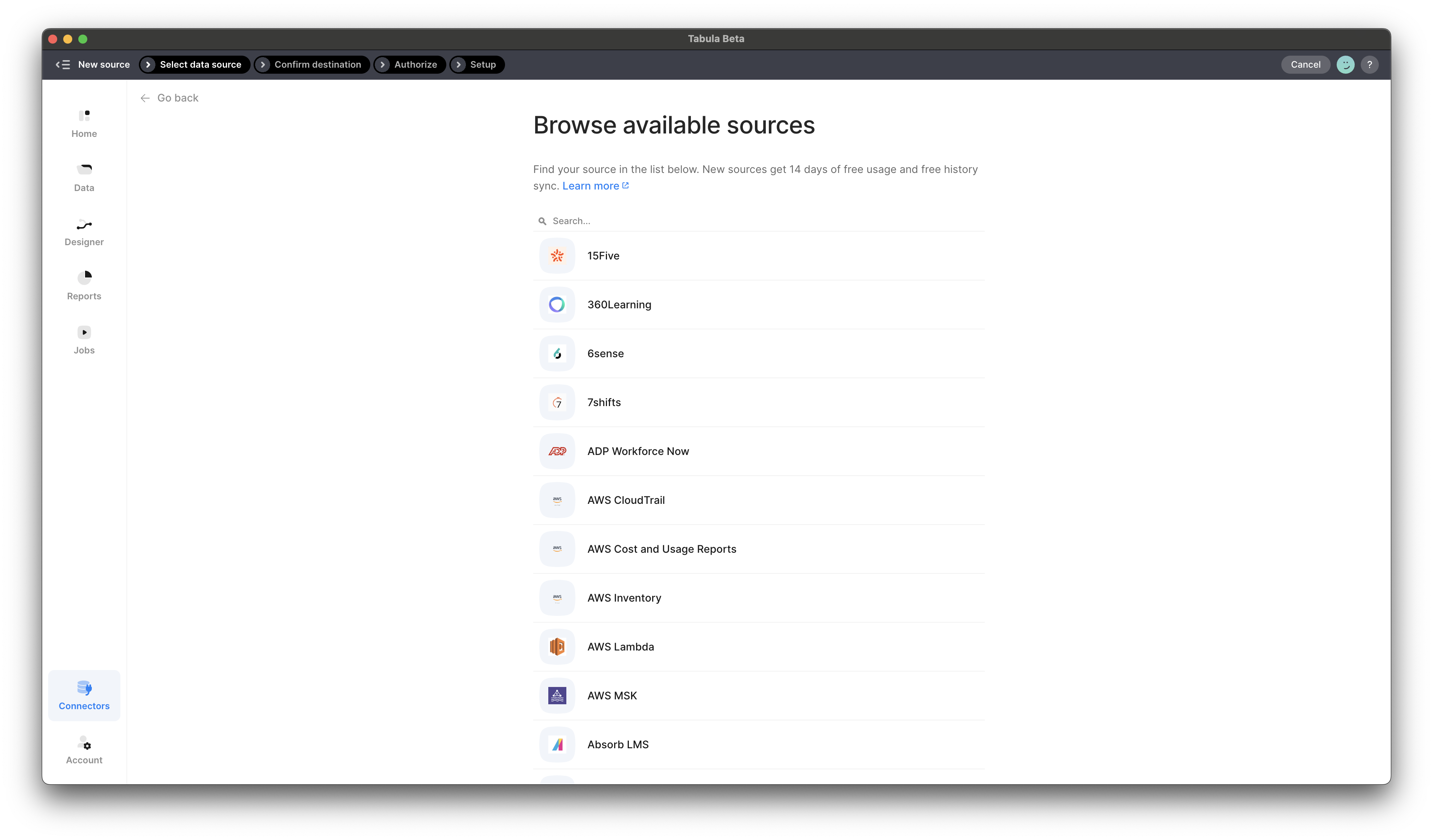 Tabula now supports seamless integration with Fivetran, enabling users to easily connect to various external data sources such as Google Analytics, Facebook Ads, or Stripe. This guide will walk you through the steps to connect and configure a data source using Fivetran in Tabula.