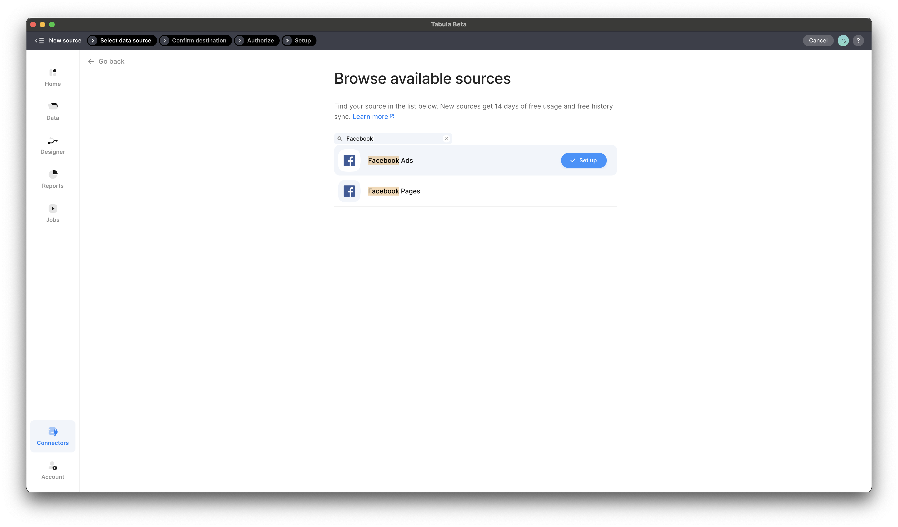 3. On the Browse Available Sources screen, search for the data source you want to connect to. In this example, we'll choose Facebook Ads.