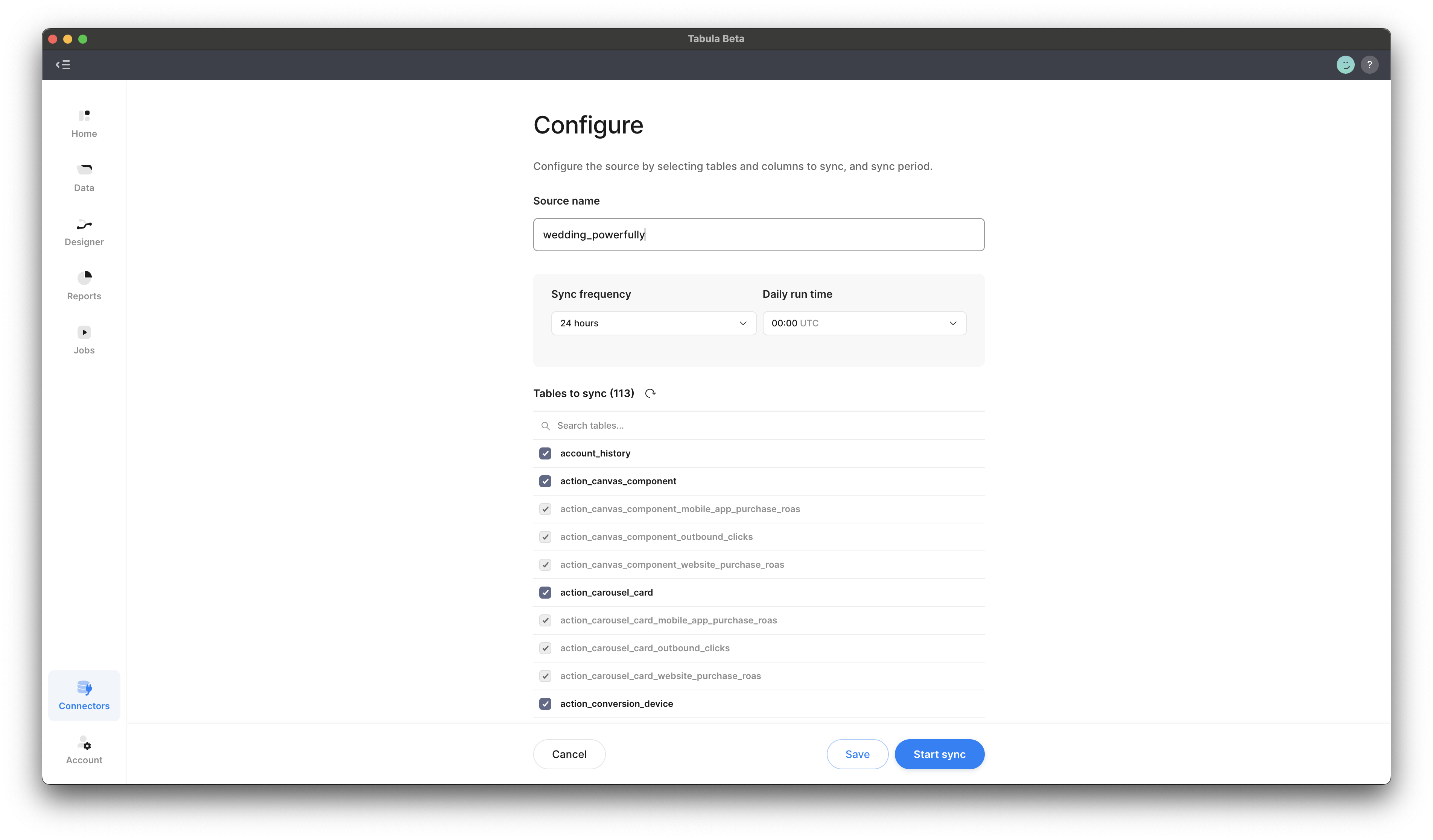 * **Select Tables**: Choose which tables to sync. (Note: loading the data schema may take some time)
