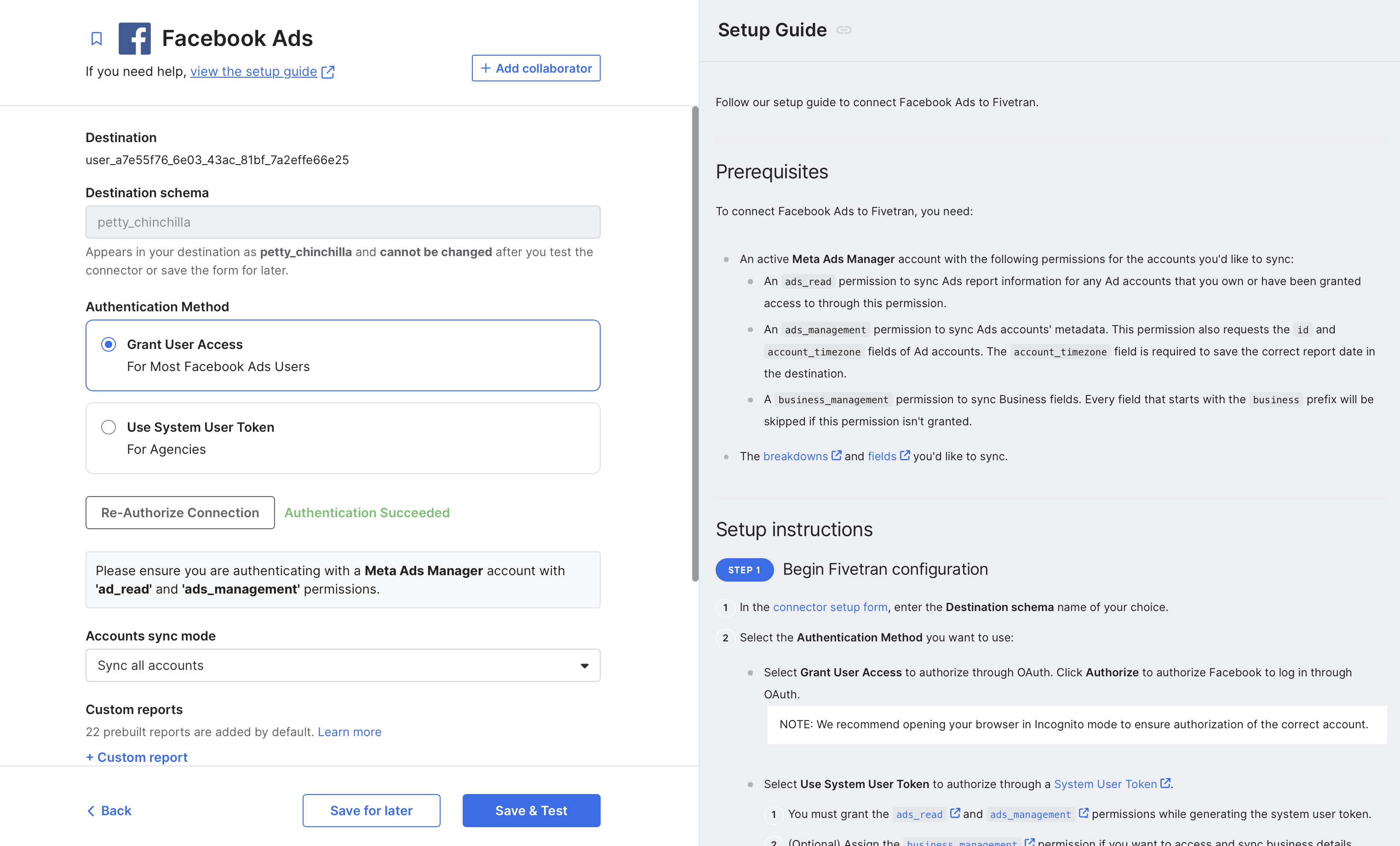 7. A browser window will open, prompting you to authorize Fivetran to access the selected data source. Follow the on-screen instructions to complete the authorization. In this example, you'll authorize Fivetran to access Facebook Ads.