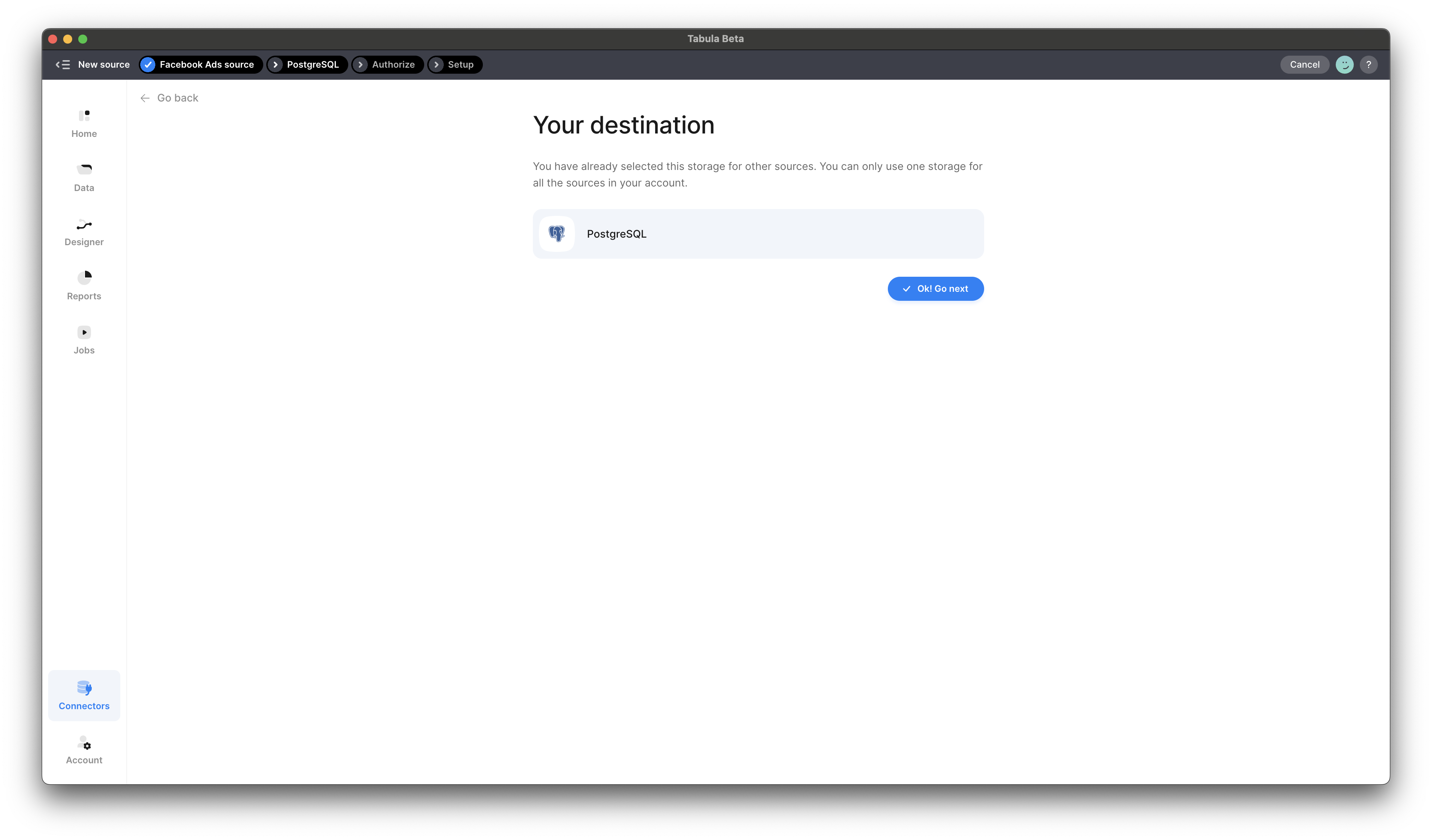 5. Select the destination database where the data from the source will be stored. If you don't have a storage solution yet, you can register for a free Snowflake trial account using our [video guide](https://docs.tabula.io/integrations/data-storages/snowflake). For this example, we will use an already connected PostgreSQL database.