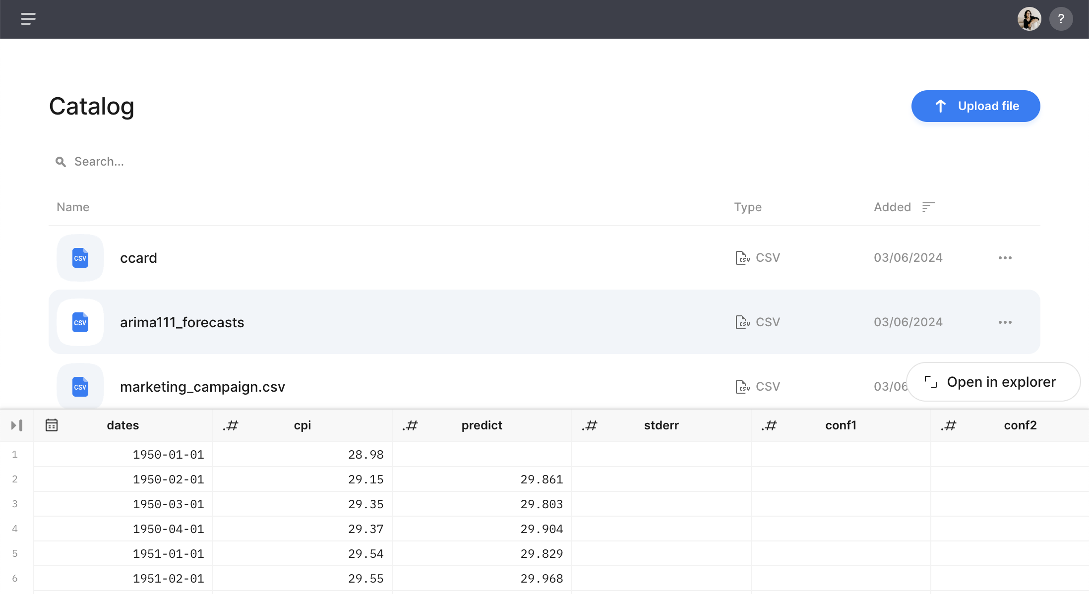 Add a new dataset to the list with the **"+ Add dataset"** button. Once you select a file, you will see a preview of 100 first rows and settings similar to those in [Source Node](https://docs.tabula.io/product-overview/exploring-data/broken-reference). If you are good with the dataset preview, click **"Add to catalog,"** the file will be opened on a full-screen in Explorer mode. You can then return to the Catalog page.